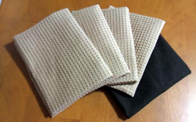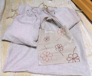 きんちゃく袋を大・中・小の3つ、手提げ袋が1つ。