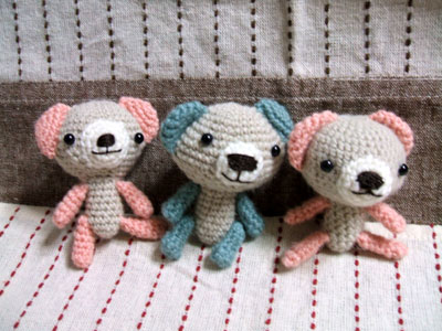 でも編むスピードがかなり速くなったので、ちゃちゃっと新しい子を作ってみました。写真の一番左が新しいくまです